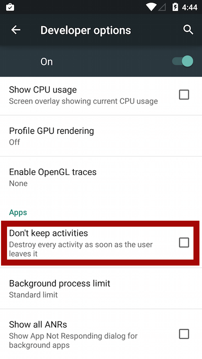 - Once you’re in the “Developer Options” menu, scroll down and uncheck the “Don’t Keep Activities” options to turn it off.